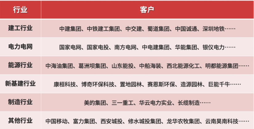 中电建集团、山东省冶金设计院股份有限公司、深圳市地铁集团有限公司、宁夏银仪电力工程有限公司、长缆电工科技股份有限公司、湖南教建集团有限公司、广东美控智慧建筑有限公司、四川省新铁投资有限公司、青海省国有资产投资管理有限公司、 广西壮族自治区钟山卷烟厂、苏州绕城高速公路有限公司、美的置业集团有限公司、中交公路规划设计院(厦门)有限公司、神华福能(福建龙岩)发电有限责任公司、中交第三航务工程局、中电建生态, 杭州宜尚、佛山市顺德区美的电热电器制造、南瑞集团有限公司、北京宏盛隆阳建筑工程有限公司、上海风领新能源有限公司、中亚建业建设工程有限公司、三峡电力、杭州华云科技有限公司、葛洲坝集团、西南交大、中亚建业、三一重工、风领建工、陕建华山集团、建投五公司、建投四公司、建投六公司、镕诚集团、云南维琦建设工程有限公司、云南元联建筑工程有限公司、保山旅投、云南元联、保山地建建筑工程有限公司、保山景和、爱创科技、四威高科、正一电气、灏讯电缆、华帝智能厨电、蓝微电子、星晨电子、达信电子、嘉联益科技、铭裕科技、明泰集团、盛杰橡胶、富冠精密、飞达吸塑、港芝公司、岩山塑业、鑫帆铜业、沈阳机床……