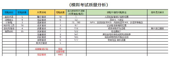 标准考试时间是4小时200题,做第一套题我的完成时间是2小时40分钟,这不禁使我陷入了深深的自我怀疑,是不是自己审题不够细致?还是应该检查一遍?不用怀疑,事实证明,第一感觉总是对的,越纠结越错,越改越错。我记得班上一位每次都2小时内完成的大神说过,他在读题的时候脑子里联想到的知识点,就直接去选项中找,找到了,ok下一题。这就又回到PMP为什么是文科考试的第二个原因了。“老张借小王几多钱”,到底谁借谁呢?阅读理解的角度不同,答案也不同,这也是考试中那20道不计分题的由来。一旦陷入命题人到底想在哪里挖坑的怪圈,就会导致时间不够或者越过正确答案去考虑刁钻角度。相信我,命题人没那么坏,不会绕两个弯来使你挂掉。所以做题切记删繁就简,直奔考点,用你的知识储备攻克它,攻克它脱了马甲戴了面具的兄弟姐妹。刷题重要,及时总结也很重要,否则费时费力毫无效果。我个人会特别注意每套题中错题最多的领域,集中巩固。(模拟考试质量分析)